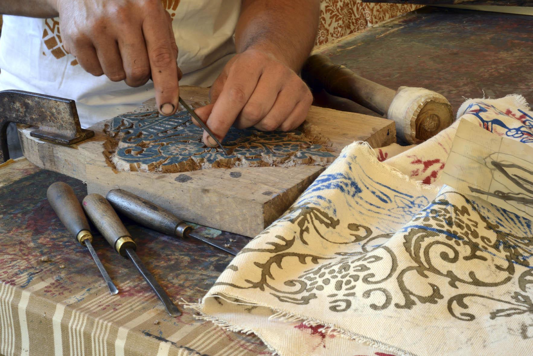 La stamperia Francioni sta a due passi da una piccola comunità di monaci benedettini, una dozzina più o meno, all’ombra della millenaria Pieve di San Giovanni Battista, fulgido tempio dagli affreschi trecenteschi. La bottega è dunque avvolta, forse protetta, da un’aura di spiritualità ma Emanuele, ultimo di sei generazioni di artigiani, applica ai tessuti, grembiuli, coperte, tovaglie, asciugamani, cuscini, centri tavola, una sorta di atea abnegazione. Realizza anche scarpe in canapa, tra cui quelle esotiche col disegno arabesque. Mentre la compagna Giulia si occupa di taglio e cucito, lui intinge nel colore stampi di pero e noce. I più vecchi risalgono a metà ottocento. I motivi, soprattutto a tema floreale, sono ispirati a ceramiche e alle antiche lavorazioni tessili. Poi ci sono i colori. “Quello tradizionale”, spiega Emanuele, “è il marrone, un’ocra di farina di grano, aceto e ruggine di ferro. Fa parte di un’antica ricetta di bottega che seguiva le fasi lunari per non far andare a male il composto”. Nella stamperia, a corredo del nostalgico arredo, ci sono una bicicletta degli anni ’30 e una preziosa coperta gialla della stessa età, tessuta al telaio e sovrastampata a ruggine. “Una volta”, racconta, “si tingeva utilizzando guado e ginestrino”.