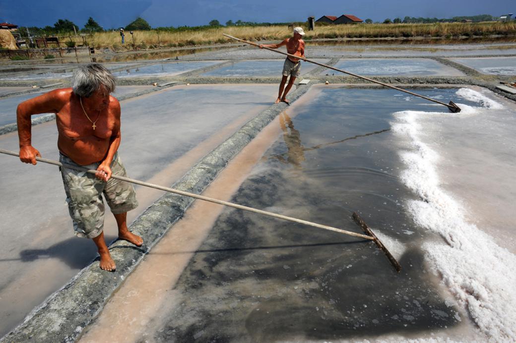 Sotto la canicola d’agosto un gruppetto di salinari sdoppiati dai riflessi dell’acqua armeggia con gli attrezzi del mestiere. Gesti scampati all’oblio grazie a personaggi dai garretti d’acciaio, a volte coi pancioni prominenti, ex salinari o figli di vecchi salinari che hanno deciso di perpetuare i segreti del mestiere. Poteva finire tutto nel ’59 quando a Cervia la produzione del sale passò da artigianale o a raccolta multipla, a industriale, cioè a raccolta unica. Fino ad allora erano quasi 150 le saline. È rimasto solo un luogo oramai dove il sale dolce di Cervia viene estratto con una lavorazione interamente manuale: la salina Camillone. Si tratta di un presidio Slow Food con percentuali minime di solfato di magnesio, sodio e potassio, privo del retrogusto amarognolo di altri tipi di sale. La catena di produzione segue ritmi perduti, un salto nel tempo, forse fino agli Etruschi. La raccolta va in scena da metà giugno ai primi di settembre, a seconda dei capricci del clima. Se piove salta tutto. Il sale dei bacini salanti viene spinto verso gli argini col ghevar, il lunghissimo bastone di legno. Formatisi i mucchietti, i vidèl, il sale viene raccolto nella panira, il paniere e trasportato fino all’aia, cioè al punto di raccolta, spingendo le stanghe del cariol, una carriola dal grosso rullo simile all’automobilina dei cavernicoli Fred e Barney. Gli attrezzi sono di legno, gli stessi che si usavano secoli fa, al tempo di Cervia Vecchia. Unici spettatori gruppi di fenicotteri che rimescolano il fango coi becchi. A volte qualche airone bianco si posa sulla punta di una garèta, la torretta rotonda di cemento armato dove un tempo i finanzieri pattugliavano i punti strategici per prevenire i furti in salina. La stagione della raccolta finisce quando la canicola se ne va. Durante il grigio inverno la Camillone verrà “affondata”, cioè allagata per proteggere il soffice limo dalle piogge. A giugno il bianco accecante tornerà a brillare sotto il sole. Appare già in lontananza, come un miraggio alla latitudine sbagliata.