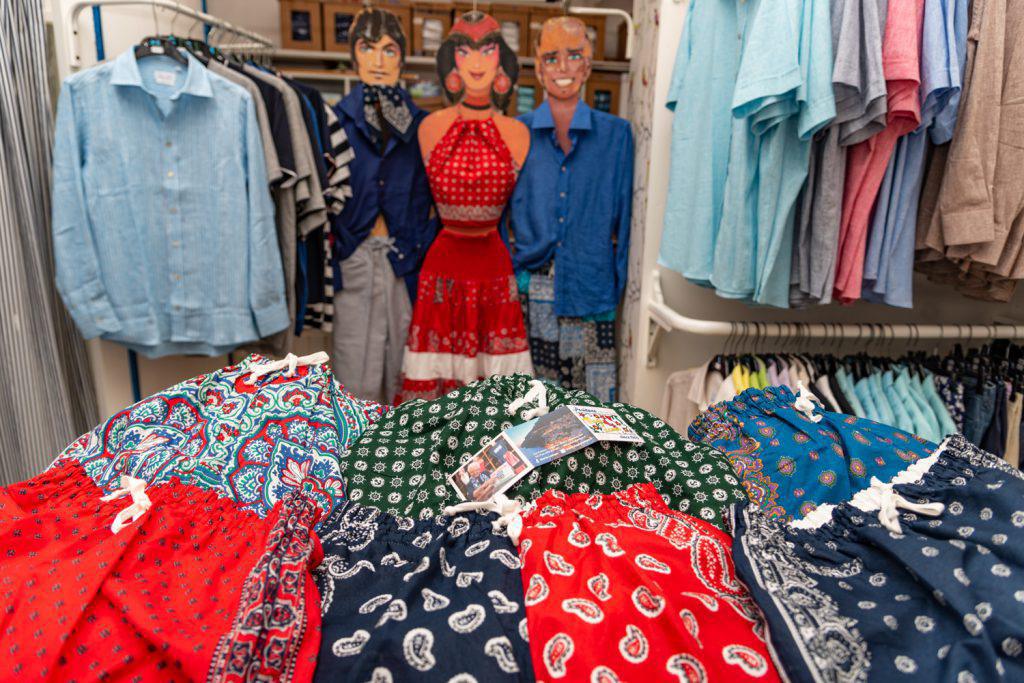 Oggi varcare la soglia significa entrare in un archivio visivo prima ancora che in una sartoria. Le pareti sono quasi invisibili, interamente ricoperte da un collage denso di fotografie sbiadite, ritagli di giornale e dediche manoscritte. I volti di Dustin Hoffman, Colin Farrell e altre celebrità internazionali testimoniano il passaggio del jet set in questo spazio angusto ma vitale. Tra gli scatti storici, i rotoli di tessuto si impilano ordinati: lino fresco, cotoni colorati e le caratteristiche "pezze" come fazzolettoni e bandane, ma anche pantaloni e costumi coloratissimi. Oggi Concetta ed Emilia, figlia e nipote di Maria, proseguono l'eredità tecnica della fondatrice, realizzando pantaloni e abiti che uniscono la praticità balneare all'eleganza sartoriale italiana. Qui l'acquisto di un capo trascende la transazione commerciale per diventare testimonianza di un'epoca in cui la velocità era sinonimo di maestria manuale e non di produzione industriale.