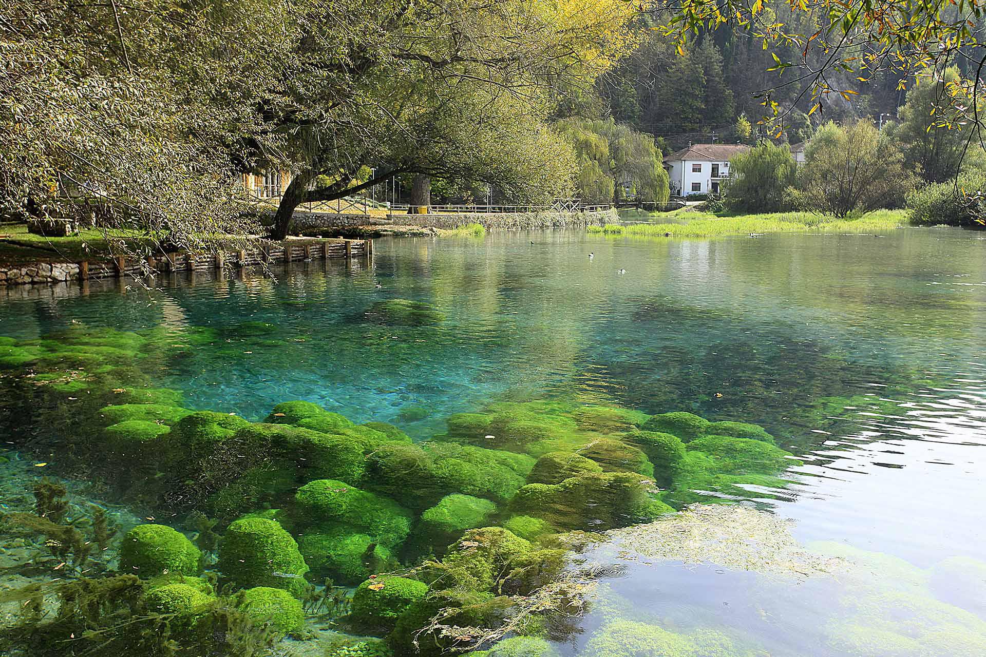 Ai piedi delle montagne della Marsica, il Lago di Posta Fibreno è uno specchio verde smeraldo di eccezionale limpidezza, alimentato da un complesso sistema di risorgive carsiche. L'acqua mantiene una temperatura costante di circa 10-11 gradi durante tutto l'anno, una condizione che favorisce la presenza di specie rare come la Trota del Fibreno. L'atmosfera è definita dalla trasparenza assoluta del fondale, dove le alghe e la vegetazione subacquea creano un mosaico di diverse tonalità di verde. Qui il silenzio è interrotto solo dal fruscio dei canneti che bordano le rive, rifugio per numerose specie di uccelli migratori e stanziali.