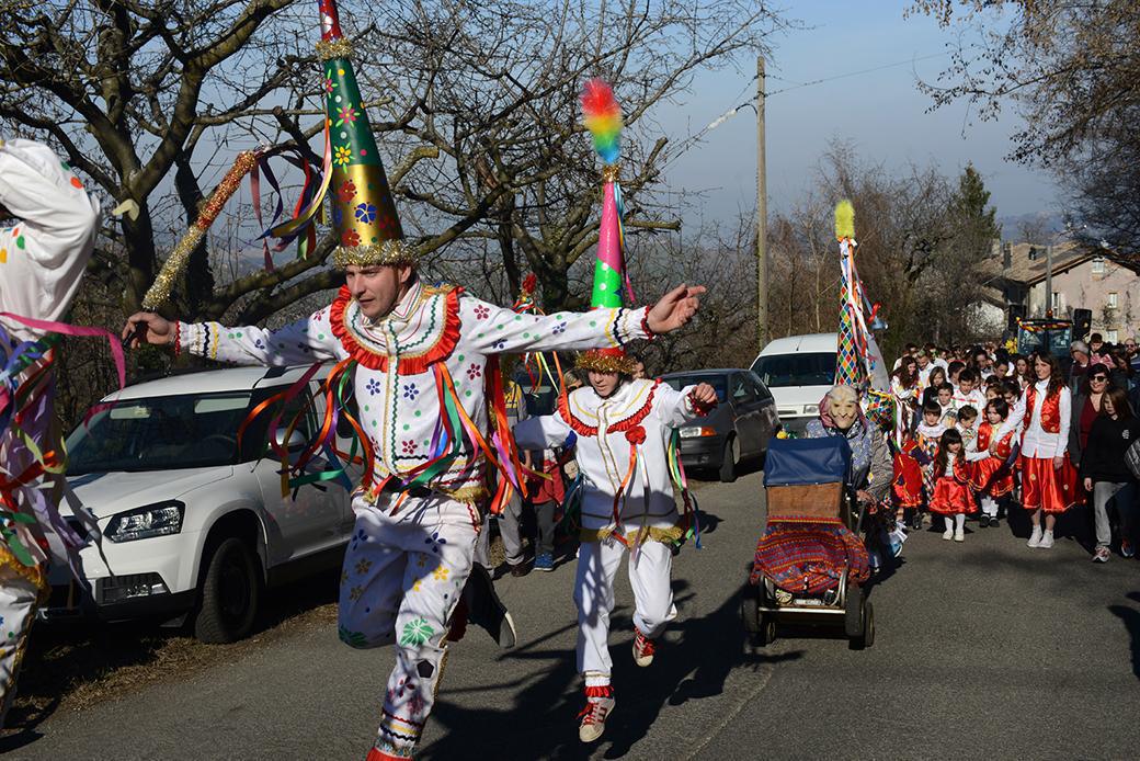 L'aria sottile dell'Appennino porta con sé il suono ritmico dei sonagli mentre le figure della Mascherata di Benedello iniziano a popolare le strade. Qui la tradizione non è una semplice sfilata ma un meccanismo simbolico che si ripete intatto. Il lacchè indossa il cappello a punta, alto, ricoperto di fiori e nastri multicolori, il fazzoletto rosso al collo e i pantaloni bianchi con la striscia azzurra o rossa laterale. I sonagli fissati alle ginocchia e ai polsi scandiscono ogni suo balzo, ogni suo passo di danza.