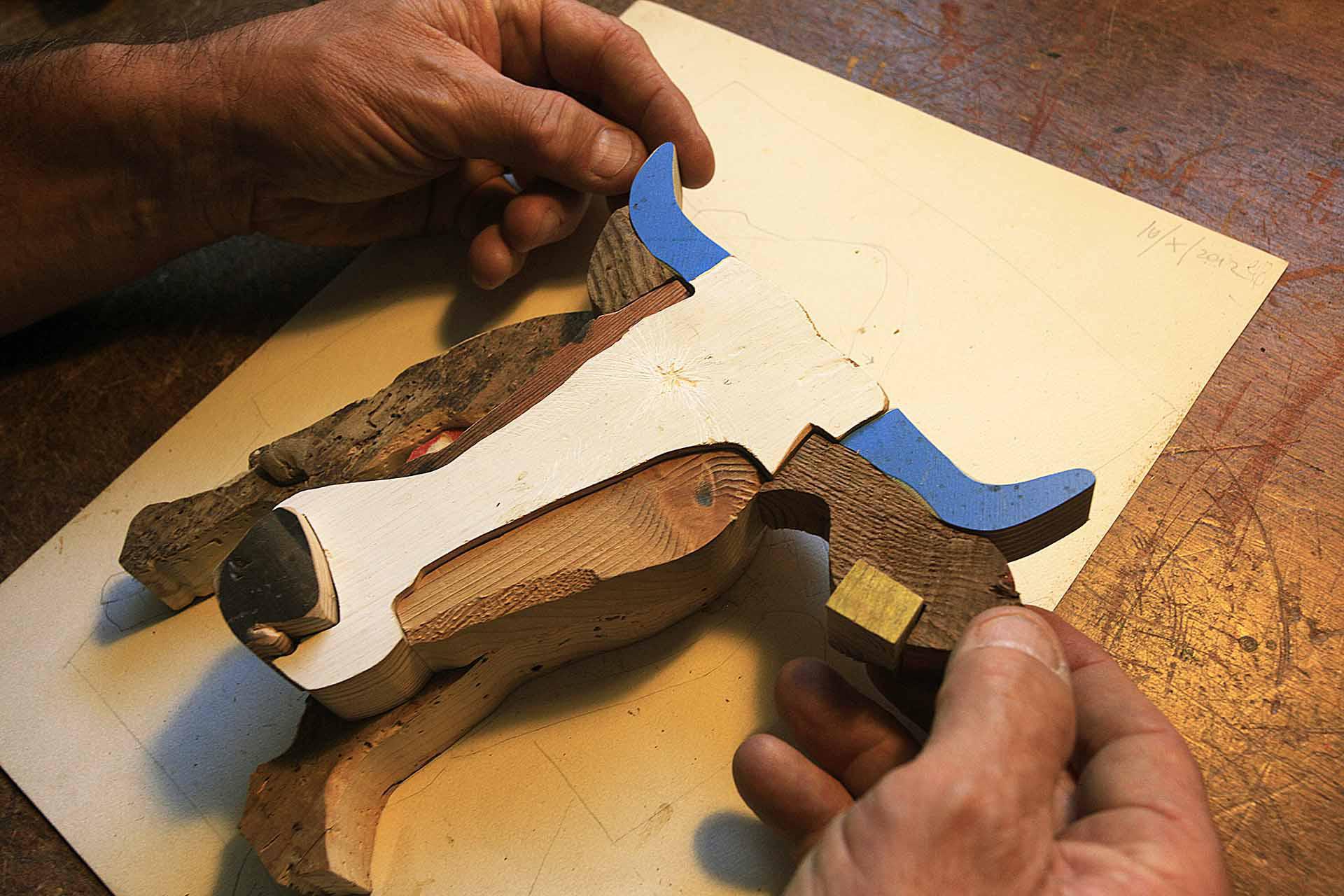Il laboratorio di Bobo Pernettaz è uno spazio dove il profumo del legno antico si mescola all'odore della colla e delle vernici. In questo luogo, l'artista opera come un "sarto" che, invece di stoffe, modella frammenti di vecchi infissi, assi di baite smantellate e scarti di falegnameria. I materiali sono rigorosamente "esausti": legni che hanno già vissuto una vita, segnati da nodi, crepe, fori di tarlo e patine naturali create dal sole e dalla pioggia. Qui il processo creativo inizia con l'osservazione della venatura o di una bruciatura, dettagli che suggeriscono la forma di un volto, il profilo di un animale o l'andamento di un paesaggio montano.