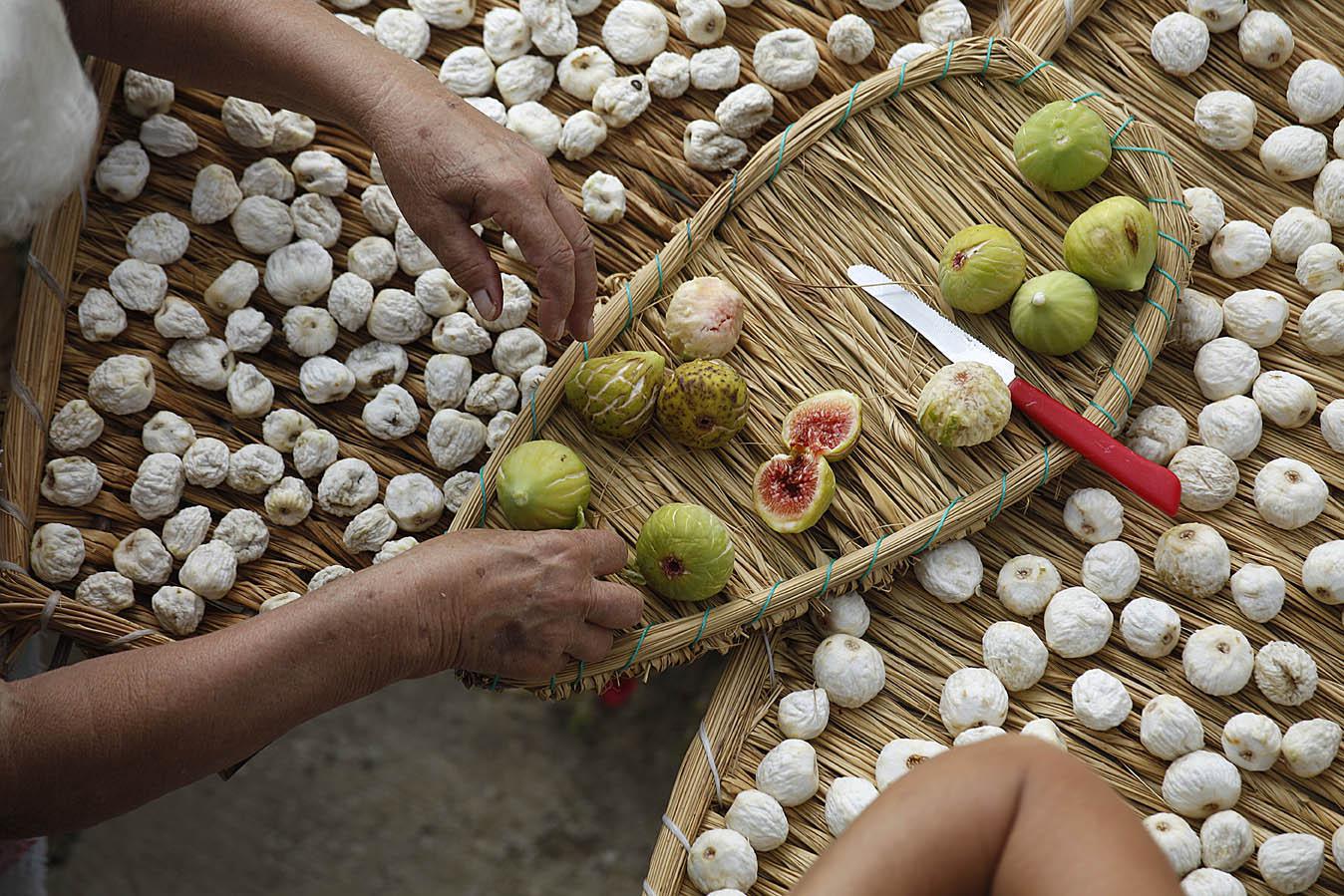 Olivi e alberi di fico disegnano il territorio cilentano esprimendo l’essenza mediterranea di questi luoghi. Catone e Varrone raccontavano che i fichi essiccati erano comunemente utilizzati nel Cilento e in Lucania come base alimentare dei braccianti agricoli. Sembra infatti che la coltivazione e produzione di fichi sia cominciata prima del IV secolo a.C. con i coloni greci. La cultivar cilentana di riferimento è il Dottato, pregiata varietà presente in tutto il Mezzogiorno. La particolarità della zona è il “Fico bianco del Cilento”, autentica eccellenza che presenta caratteristiche di gran pregio: polpa abbondante e pastosa dal gusto molto dolce, dal colore giallo ambrato. Può essere gustato fresco o essiccato. L’essiccazione si ottiene con una lavorazione che, secondo l’antica tradizione cilentana, avviene con un lento processo di cottura in forno. A lavorazione ultimata il frutto assume una colorazione marroncina e integra essenze aromatiche determinate dalla bruciatura del legno di ulivo e quercia, nonché dalle foglie di alloro. Per le sue qualità il Bianco del Cilento costituisce una DOP (Denominazione di Origine Protetta) di grande importanza. Vari sono i modi di preparazione di fichi essiccati frequentemente farciti con ripieno di noci e mandorle, profumati col finocchietto selvatico, oppure ricoperti di cioccolato. La tradizione locale prevede anche il trattamento dei fichi freschi sbucciati e messi ad essiccare al sole che sono comunemente noti sul territorio come fichi mondi, mmunnati o pelati